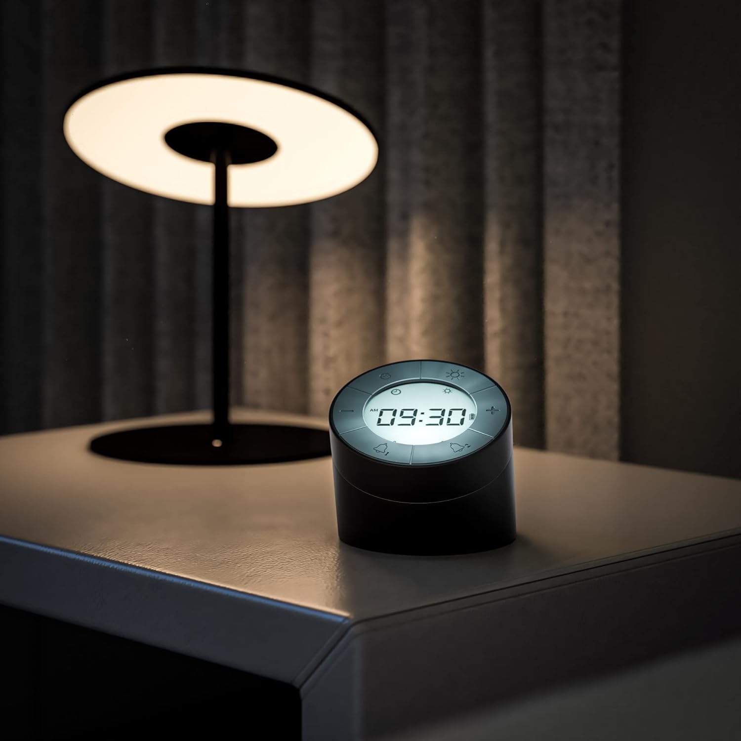 - Tagsüber fungiert er als zuverlässiger Digitalwecker mit zwei individuell einstellbaren Weckzeiten, nachts verwandelt er sich in ein sanftes, dimmbares Nachtlicht – einfach umdrehen und genießen.